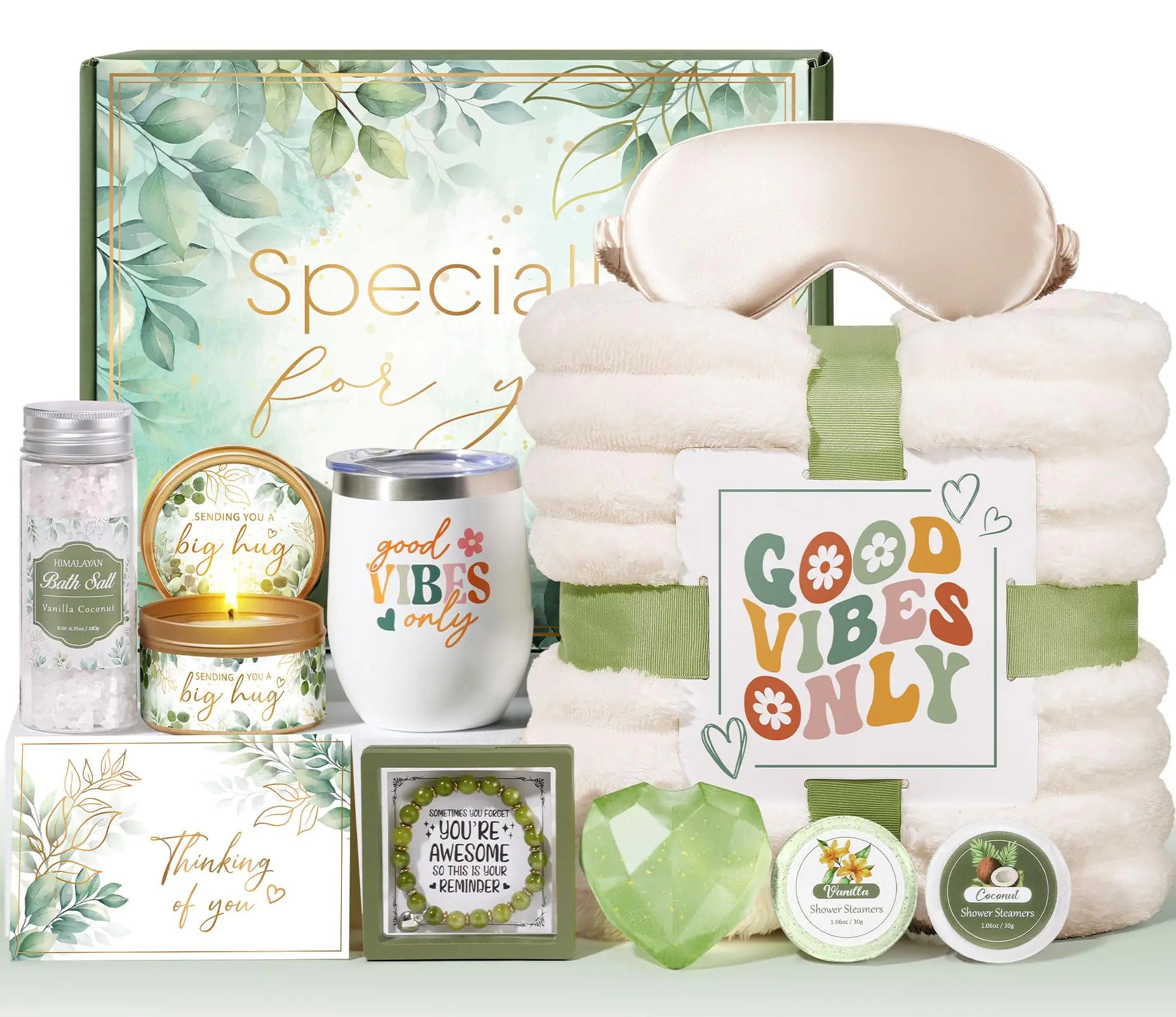 [UNIQUE SELF CARE GIFTS BASKET: Still searching for a luxury gift set for women to brighten your loved one’s day and fill it with good vibes? MAYICIVO unique gifts for women make thoughtful and valuable birthday gifts for women mom sister her best friends daughter girlfriend wife grandma boss lady coworkers teacher nurse etc to show her how much she is cherished. Ideal as self care gifts for women spa gifts for women inspirational gifts for women stress relief gifts get well gifts LUXURY SPA GIFT BASKETS FOR WOMEN: MAYICIVO Spa Set for Women Gift Get Well Soon Gifts Best Friend Birthday Gifts for Women is designed and selected to pamper and delight that special lady in your life designed to bring her endless joy and convey warmth and deep love! Perfect as Christmas gift baskets for women Mothers day gifts for mom mother in law Valentines day gifts for her wife girlfriend care package for women friendship gifts thank you gifts for women thinking of you gifts for women 11PCS CARE PACKAGE FOR WOMEN: The MAYICIVO relaxing spa day gifts for women includes a collection of thoughtfully curated items. Includes luxury throw blanket 12oz insulated tumbler 6oz scented candle handmade soap 6.35oz bath salts 2 shower steamers silk eye mask stone bracelet decent gift card and exquisite gift box. Such a thoughtful and heartwarming gifts for women birthday unique! Surprise her with this self care gifts set for women and let her indulge in comfort and relaxation LUXURY THROW BLANKET: The soft blanket in our self care kit spa gift baskets for women is made from high-quality microfiber polyester offering her ultimate comfort & relaxation. The wrapping card features the inspirational words “GOOD VIBES ONLY” guaranteed to lift her spirits and ideal for keeping her warm and cozy. Includes a lightweight soft silk eye mask that hugs her skin for exceptional relaxation. Send this bath gift set for women relaxation gifts to convey your warmest care & love INSULATED VACUUM TUMBLER: Made of premium 18/8 stainless steel with a double-wall vacuum insulated design this 12oz tumbler with lid can keep drinks cold for up to 8 hours or insulated for up to 4 hours perfect for iced coffee juice tea wine champagne sodas etc. The tumbler is printed with the inspirational words “good VIBES only” to inject a positive energy into her daily life. Ideal Best Friend gifts for women sending hugs gifts mom birthday gifts to make her feel relaxed and warm ULTIMATE RELAXATION SPA GIFT BASKETS: Made from natural wax the scented candle burns evenly and smokelessly for up to 40 hours and the bath salts are rich in minerals helping to relax. The care package for women also includes handmade soap and 2 shower steamers. With this self care basket pampering gift for women she will enjoy a cozy and relaxing bubble bath experience that soothes her body and mind. A thoughtful best friend happy birthday gifts for women get well soon gift baskets for women UNIQUE BIRTHDAY GIFTS FOR WOMEN: MAYICIVO Birthday Valentines Day Mothers Day Christmas Gifts for women mom her sister friend includes a stylish bracelet made of 8mm premium turquoise stones. The bracelet comes in an elegant clamshell gift box with a heartfelt card that reads "Sometimes You Forget You\re Awesome" sure to warm her heart. Beautifully packaged in a unique box with a decent gift card this thoughtful chic women gifts spa gifts set is perfect for bringing her joy & surprises anytime]